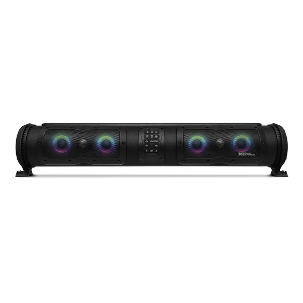 SE28 サウンドエクストリームエリート パワースポーツ サウンドバーは、LED照明と最新のスピーカーにより豊かでパワフルなサウンドを実現します。100%防水、防塵、防汚の8つのマリングレード スピーカーで500ワットの高出力を実現しています。四輪駆動車、SUV、ゴルフカー、バギー、キッチンカー、ヨット、ボートなどに最適です。独自のEcoCast機能を使用すると、最大100台のサウンドエクストリームスピーカーを連携できます。独自のLEDCast照明コントロールで、LED照明や、オプション(近日発売)のLEDライトキットのLEDをカラフルにコントロールできます。